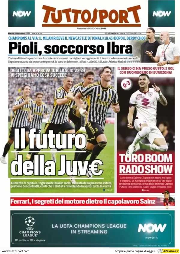 "Il futuro della Juve", si legge sulla prima pagina dell'edizione odierna di TuttoSport. "Pioli, soccorso Ibra", l'ex attaccante svedese ha fatto visita al Milan.