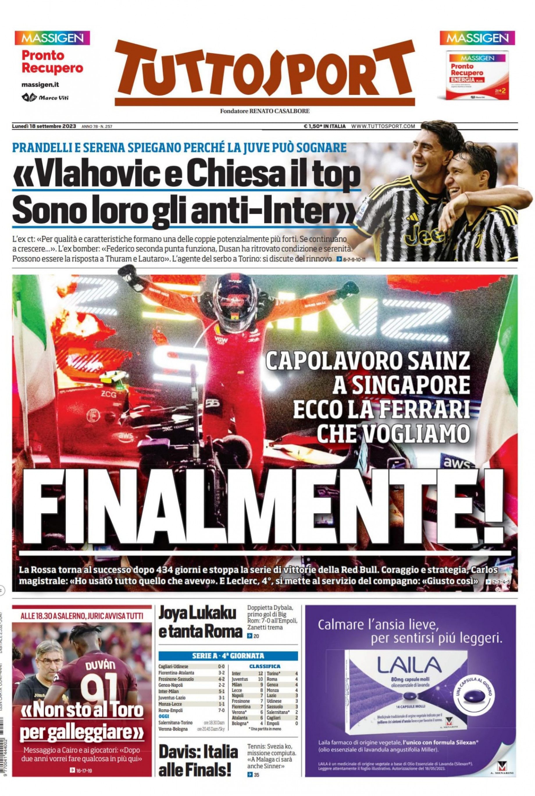 PRIMA PAGINA TUTTOSPORT - Prandelli: "Vlahovic-Chiesa top, sono gli anti-Inter"
