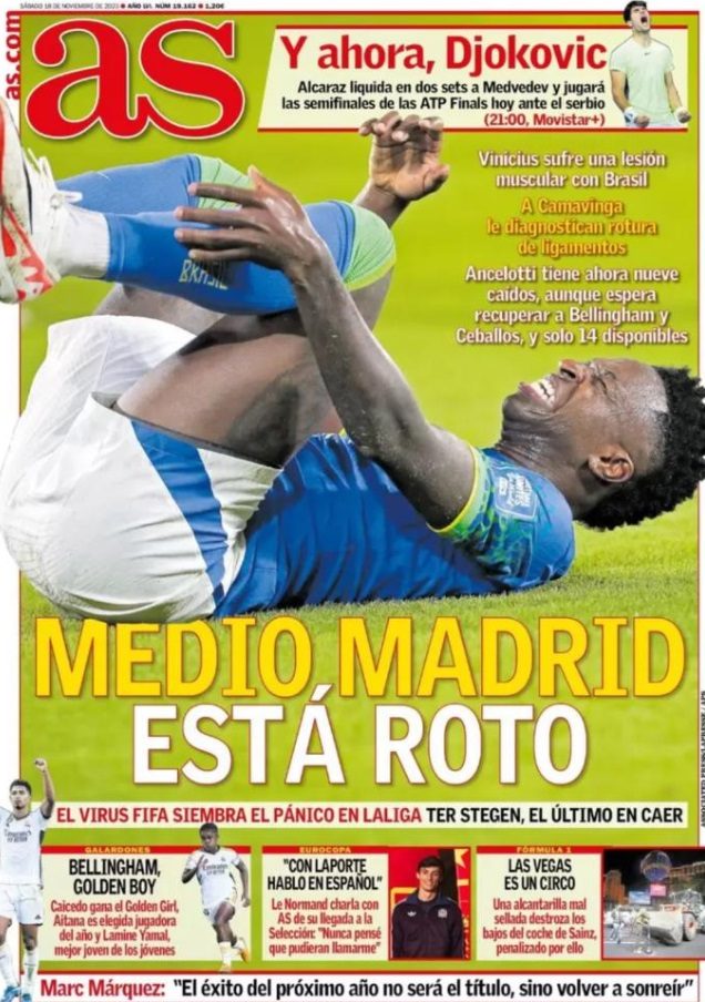 Carlo Ancelotti, allenatore del Real Madrid, deve fare fronte alla emergenza infortuni. "Metà Real Madrid è distrutto", titola il principale quotidiano sportivo spagnolo Diario As in merito agli infortuni. Quello delle partite internazionali viene definito un Virus che sta attaccando il Real. Con gli ultimi infortuni di Vinicius col Brasile e Camavinga con la Francia sono ora 9 i giocatori infortunati sui 23 in rosa. Una vera e propria tegola che si è abbattuta sull'ex tecnico, tra gli altri, di Napoli e Milan.