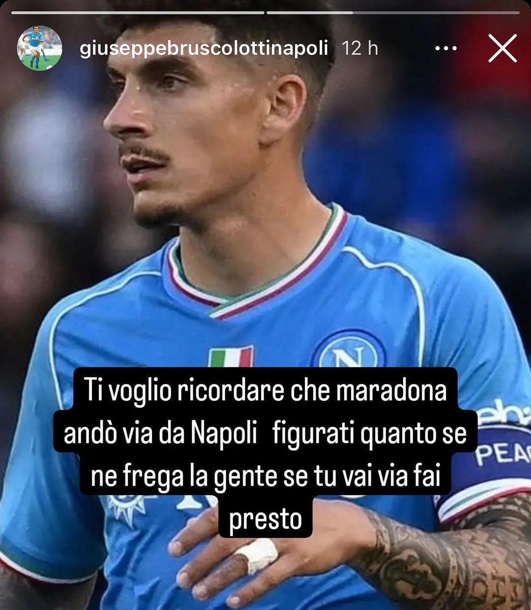 Ecco quanto scritto dall'ex difensore centrale del Napoli all'indirizzo di Di Lorenzo: "Ti voglio ricordare che Maradona andò via da Napoli. Figurati quanto se ne frega la gente se tu vai via, fai presto". Ed ancora: "Se vuoi andare, tira fuori le palle. Ti voglio ricordare che è andato via Diego, quindi con tutto il rispetto non ce ne frega un c...".