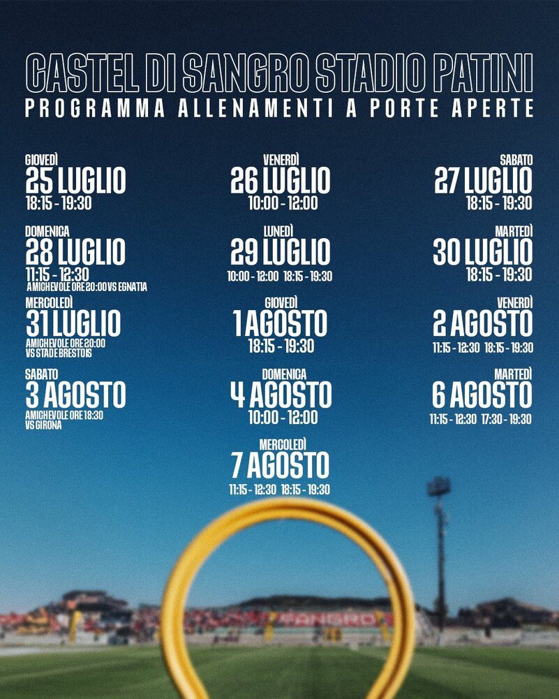Il Napoli ha ufficialmente iniziato il ritiro di Castel di Sangro 2024, gli azzurri sono arrivati in Abruzzo nella giornata di oggi 25 luglio 2024. Nel pomeriggio prima seduta di allenamento. Il club azzurro, tramite i propri canali ufficiali, ha diramato date e orari degli allenamenti a porte aperte della squadra azzurra di Antonio Conte. Tutti gli allenamenti della compagine partenopea si svolgeranno allo stadio Teofilo Patini di Castel di Sangro, capienza circa 4mila posti.