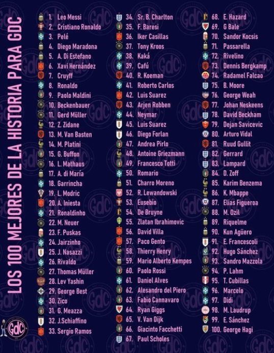Il portale argentino GDC (Gol de Corazón) ha pubblicato la Top 100 dei calciatori più importanti della storia. Il primo posto in classifica è andato all'argentino Lionel Messi, Cristiano Ronaldo si è dovuto accontentare del secondo gradino del podio. A seguire nella top 100 ci sono Pelé, Diego Armando Maradona (incredibilmente solo quarto), Alfredo Di Stefano, Johan Cruyff, Ronaldo (Brasile), Paolo Maldini (Italia), Franz Beckenbauer (Germania).
