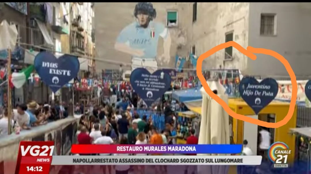 Il giornalista Peppe Iannicelli, attraverso un post pubblicato sul suo profilo Facebook ha posto l'attenzione sul murales di Maradona e sull'insulto ritenuto "fastidioso" ai tifosi della Juventus: "L’insulto ai tifosi della Juve offende la memoria di Diego Armando Maradona. Davanti al Murales di D10S ai Quartieri Spagnoli sono stati esposti tre cuori di stoffa uno dei quali contiene l’oltraggioso “Juventino Hijo de Puta”. Questo orpello meschino (documentato in un servizio di Canale 21) va rimosso immediatamente".