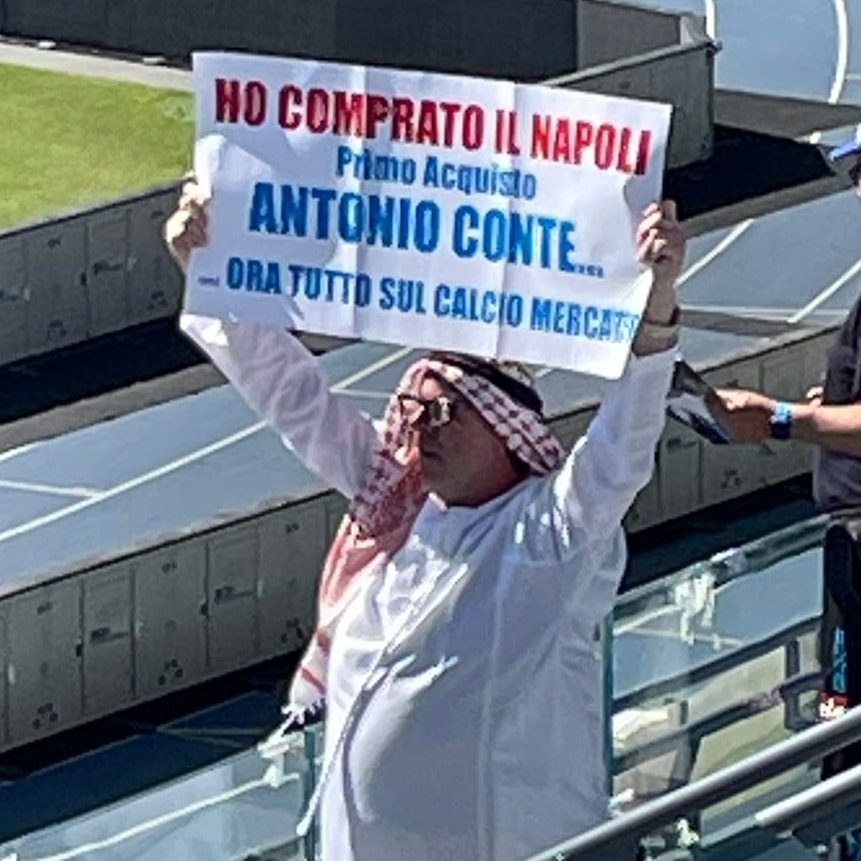 Cresce l'attesa allo stadio Diego Armando Maradona per la gara di campionato tra Napoli e Roma, match valido per la 34esima giornata del campionato di Serie A. Gli azzurri sperano di tornare alla vittoria. Nell'impianto di Fuorigrotta è comparso un curioso personaggio che con abiti orientali ha mostrato il seguente cartello: "Ho comprato il Napoli, primo acquisto Antonio Conte... Ora tutto sul calciomercato", una simpatica trovata che coincide anche con le speranze di molti tifosi partenopei.