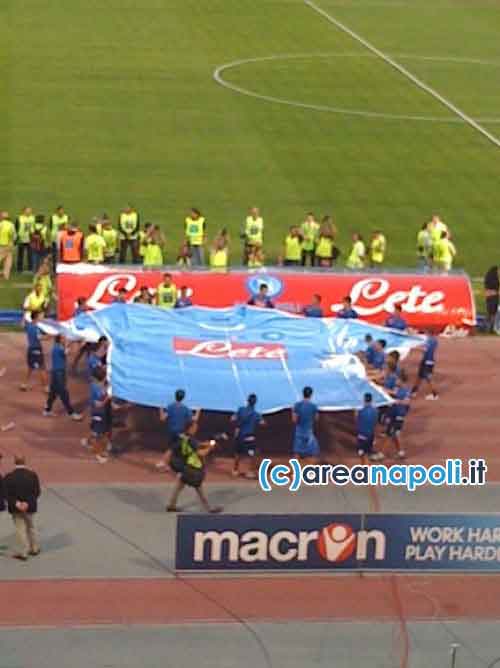 Giro di campo per la gigantografia della nuova maglia del Napoli, versione 2010-2011: i raccattapalle la portano sulla pista d'atletica, rivolta al pubblico. Grande festa in attesa del fischio d'inizio di Napoli-Wolfsburg.