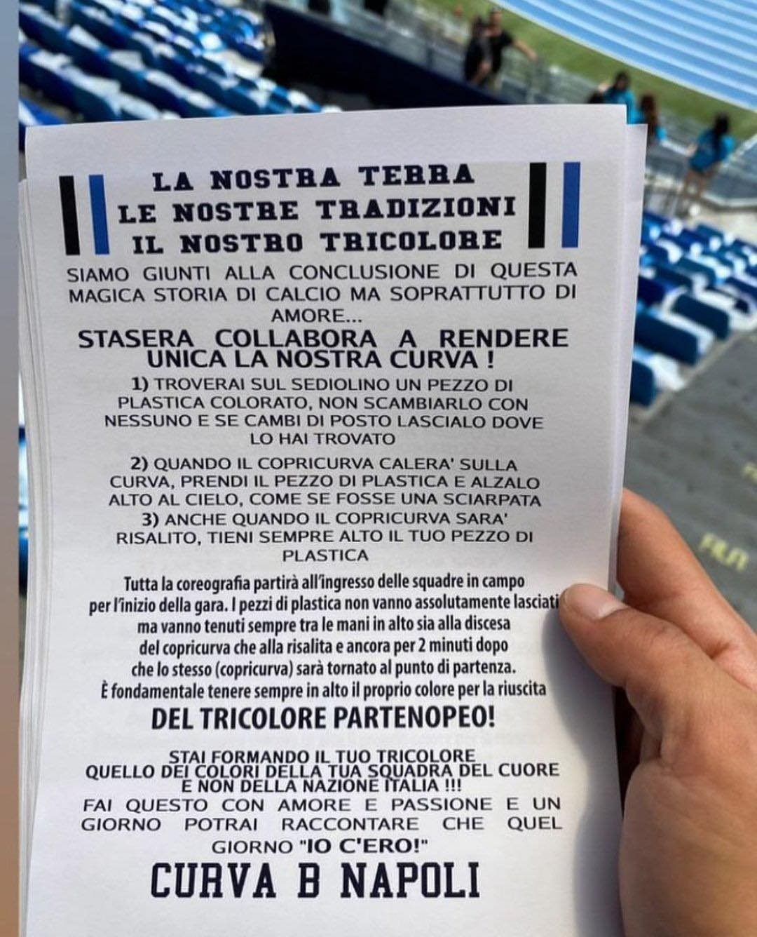 In occasione dell'ingresso in campo di Napoli-Sampdoria ci sarà una gigantesca e meravigliosa coreografia che potrebbe coinvolgere tutto lo stadio Maradona. Di sicuro coinvolgerà la Curva B, come testimoniano questi volantini che tutti gli spettatori troveranno sul proprio sediolino. Si tratta di tutte le info da seguire affinché la coreografia riesca. Nel volantino vengono fornite istruzioni precise per il buon esito della scenografia che potrebbe fare il giro del mondo per bellezza e unicità.