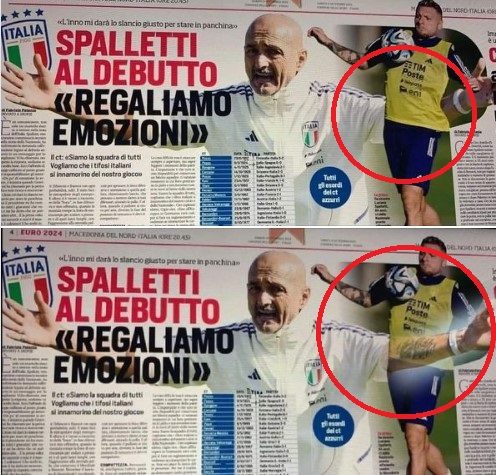 Sulle pagine di un noto quotidiano sportivo focus sulla nazionale italiana guidata dal neo-tecnico Luciano Spalletti, ex mister del Napoli campione d'Italia. Come è possibile notare, è stata scelta una immagine dell'allenatore toscano che sta spiegando, con le braccia allargate, alcuni schemi ai calciatori. Sul braccio sinistro, però, dove si è fatto tatuare il suo amore per i partenopei con tanto di logo e terzo tricolore della storia del club, il grafico ha sovrapposto Ciro Immobile.