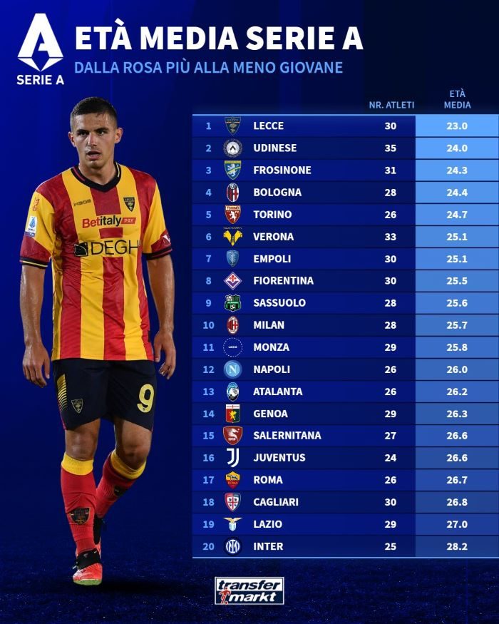 Anche l'Inter si è ringiovanita, ma nonostante ciò resta la rosa più "anziana" con una media di 28,2 anni. Il Lecce, invece, si aggiudica il primato di squadra più giovane del massimo campionato italiano, con una media di età di 23 anni.