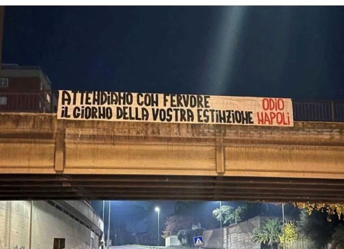 È ciò che è accaduto nelle vie della capitale, poco più di un'ora prima del fischio d'inizio di Roma-Napoli: uno striscione firmato da una frangia della tifoseria giallorossa, un messaggio violento, disumano, diretto contro un'intera città. Una frase che non appartiene al calcio, né alla rivalità sportiva, né alle sane passioni che la Serie A dovrebbe alimentare. Una frase che appartiene solo all'intolleranza più becera: "Attendiamo con fervore il giorno della vostra estinzione".