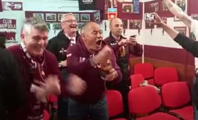 Enorme gioia in un club di tifosi della Salernitana per il pareggio ottenuto contro il Napoli allo stadio Maradona.